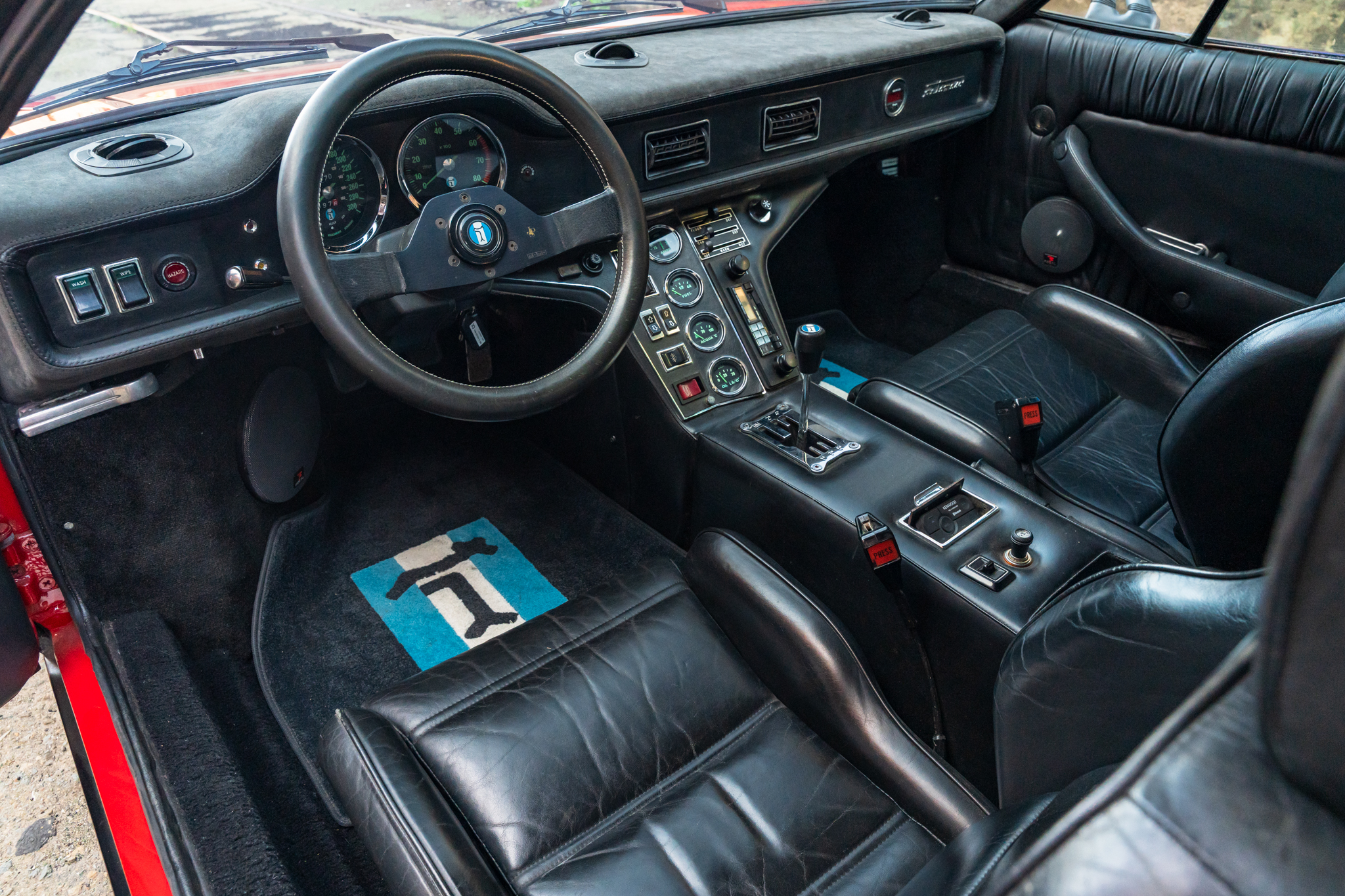 The driver’s seat was mounted directly to the floor to provide more headroom and the original sliders are included. The dashboard was also removed and the Alcantara upholstery was replaced. The A pillars and headliner were also retrimmed in the same material. A period Alpine cassette deck was installed, together with new components and Bluetooth adapter.