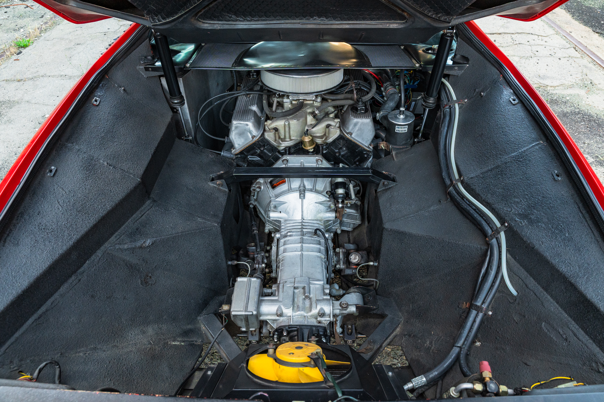 The body restoration involved removing the windows, all trim, and the fuel tank so that the car could be completely resprayed, which was performed with single stage urethane Glasurit paint by Tony Fabozzi, an award-winning paint experienced with Panteras (and other exotics). The body was found to be free of rust when it was prepped for the repaint. The factory paint scheme was employed, including the black lower beltline. All black trim was stripped and powder coated in the correct satin black finish. After reassembly, the car was ceramic coated.
