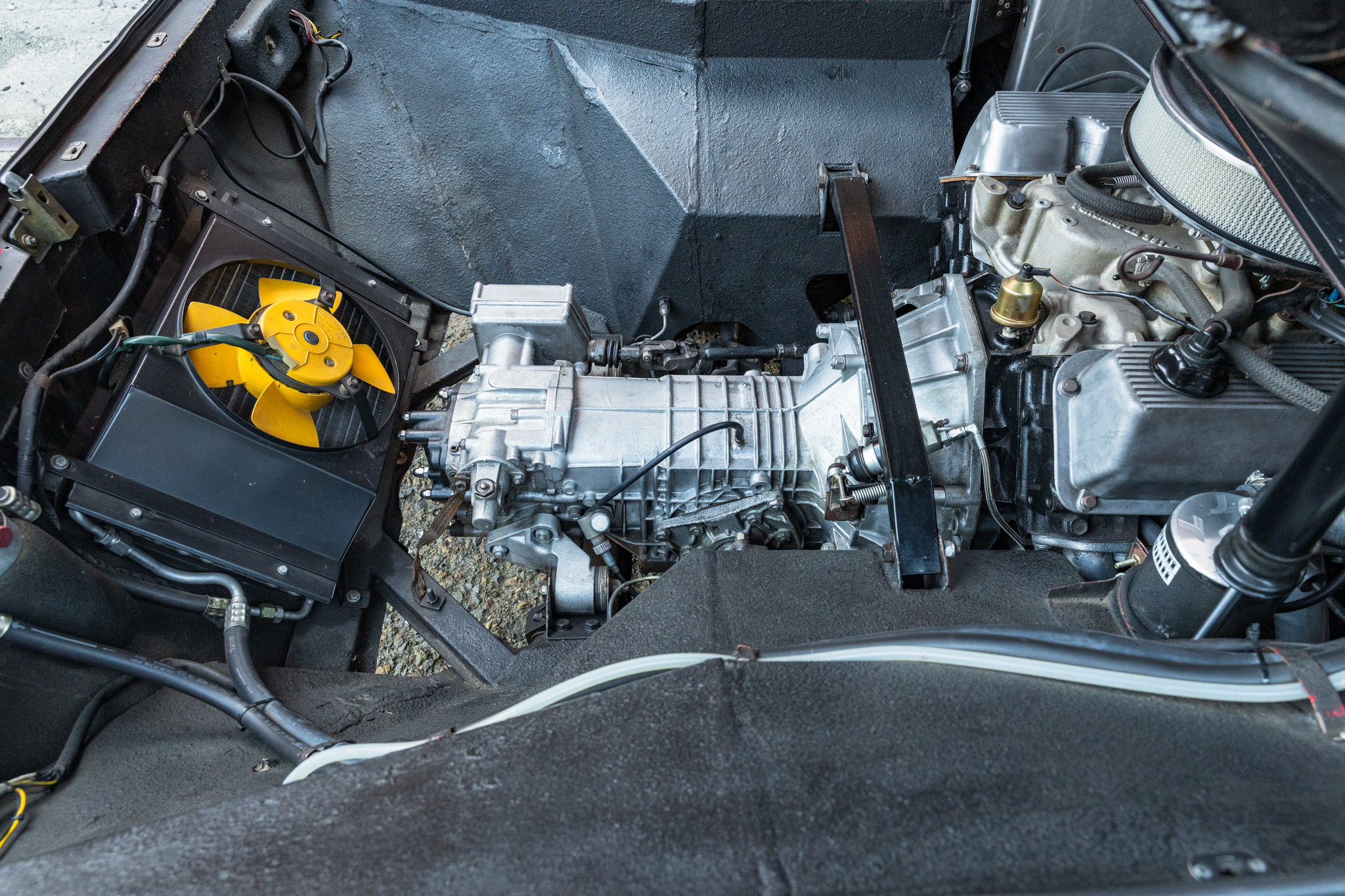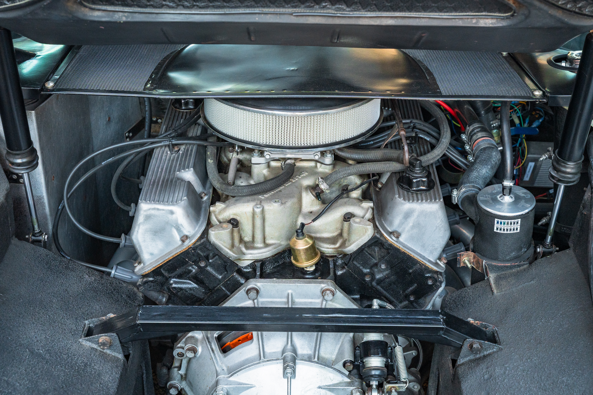The mechanical work was performed by Mike Cook, former supervisor at the specialist shop Hall Pantera. Cook was also a hot rodder who built and raced speed record cars and set a Pantera speed record at Bonneville. The engine of the car was removed to inspect its condition, and the intake manifold and oil pan were removed, the bottom end was inspected, a new water pump and carburetor were fitted, all gaskets were replaced, and the factory GTS headers were ceramic coated as were the muffler pipes. A new 100 amp alternator was installed while the engine was out. The dual points ignition system was replaced with a Duraspark Type 1 (40,000 volt version) ignition system with a rebuilt Davis HP Duraspark distributor.